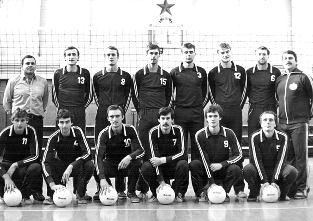 Nejúspěšnější část trenérské kariéry Dyndy Eberta (jak zní jubilantova přezdívka) dokumentuje kolektivní fotka volejbalistů RH Praha v sezoně 1982/83. Nahoře zleva druhý trenér Jiří Ebert, Luboš Voplatek, Josef Novotný, Daniel Dvořák, Michal Galis, Pavel Barborka, Josef Vondrka a první trenér Zdeněk Pommer, dole zleva Jiří Melichar, Luboš Maršoun, Pavel Řeřábek, Tomáš Sýkora, Petr Brom a Milan Černoušek.