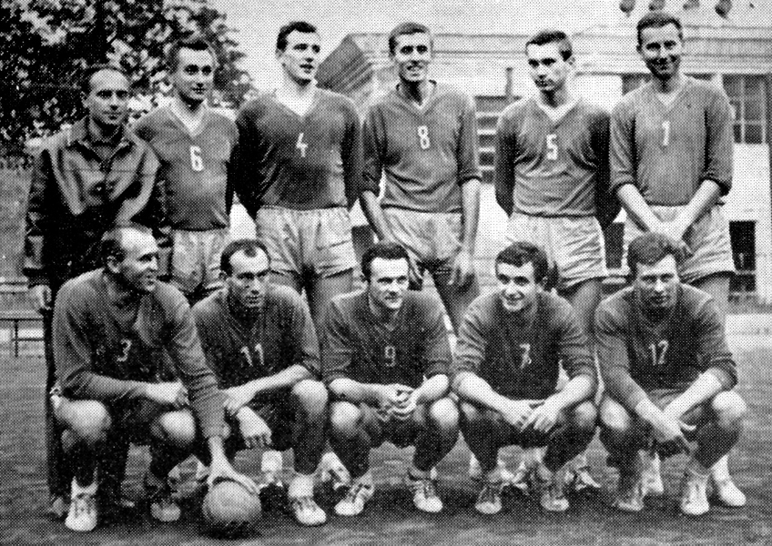 Mistři ČSSR pro rok 1965 - volejbalisté Spartaku Brno ZJŠ. Nahoře zleva vedoucí družstva Z. Velan, Handlíř, Petlák, Pavčo Schenk, D. Koudelka a Lípa, dole zleva hrající trenér Láznička, Procházka, Václavík, Uherek a Derka. Z vítězného kádru na snímku chybí hráči Ovesný, Petr Schenk a L. Zajíček.