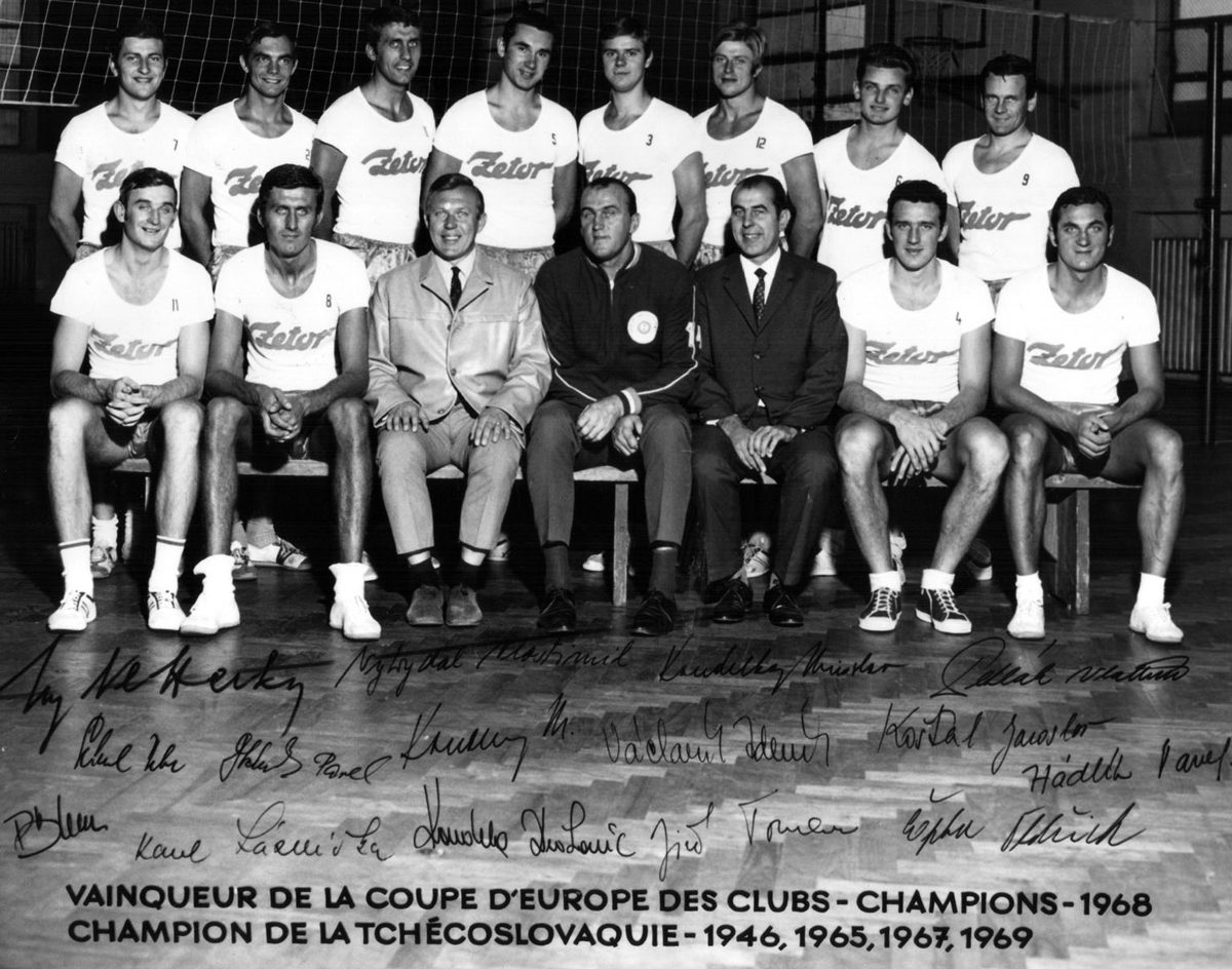 Na snímku z roku 1969 volejbalisté Zbrojovky Zetoru Brno po zisku třetího mistrovského titulu. Na propagační fotce s komentářem ve francouzštině nechybí autogramy a připomenutí triumfu v PMEZ 1968. Zleva stojí Vykydal, M. Řezníček, Petr Schenk, D. Koudelka, Hádlík, Košťál, J. Toman a Václavík. Zleva sedí Čapka, Pavčo Schenk, předseda oddílu Ing. Bőhm, trenér Láznička, vedoucí družstva Ing. Herka, Petlák a M. Koudelka.