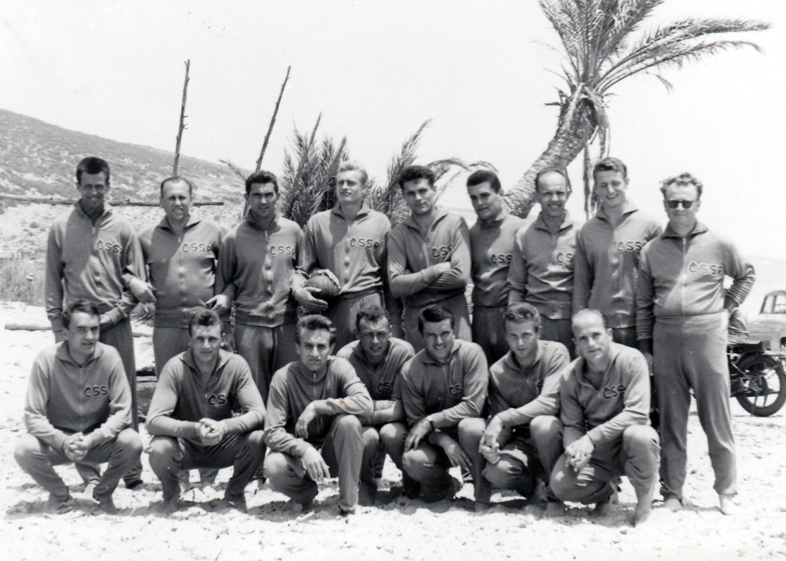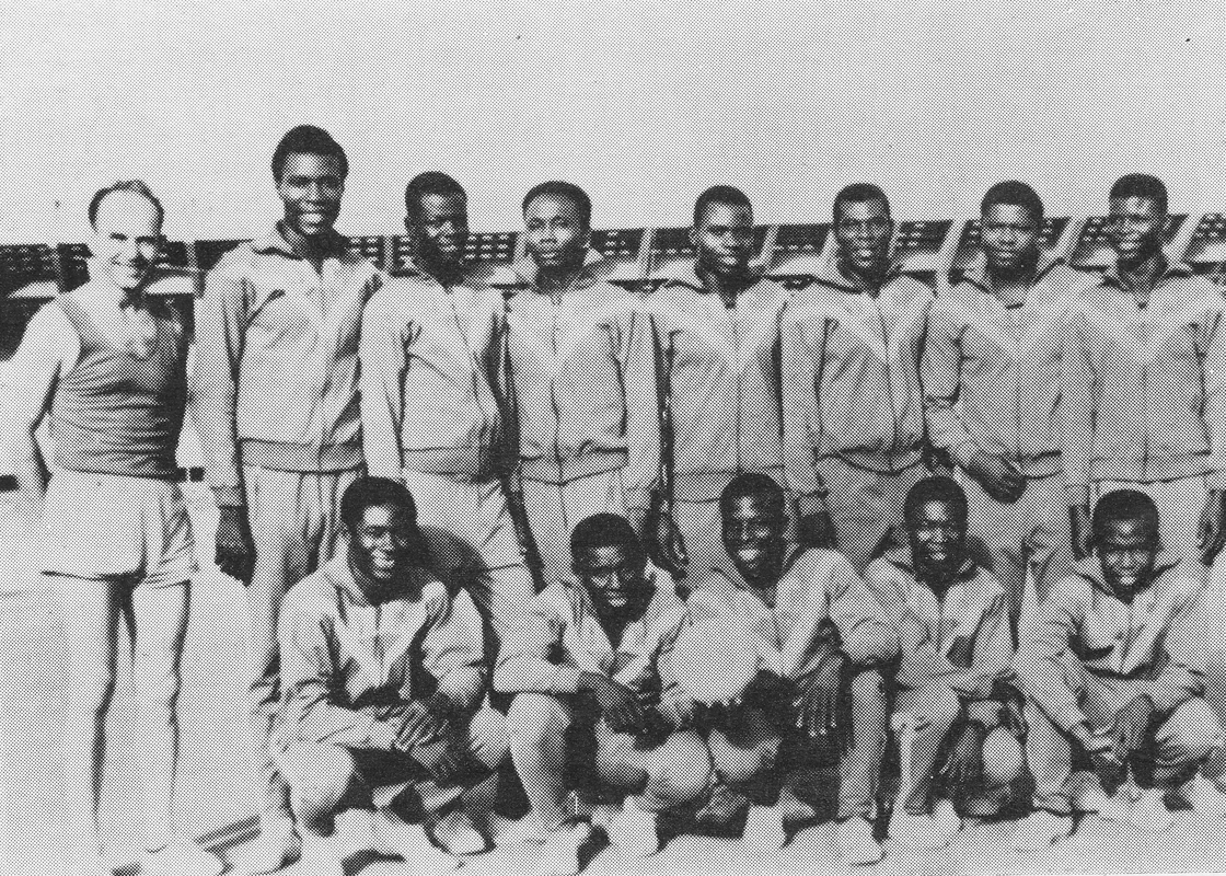 Nalevo stojící trenér Ladislav Drobný v roce 1965 s národním týmem volejbalistů Ghany, které připravoval půl roku.