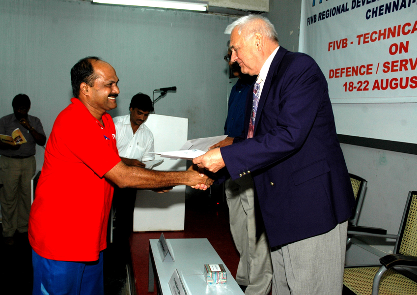 Vyvrcholením každého mezinárodního kurzu trenérů FIVB je vždy slavnostní akt předávání osvědčení o získané trenérské kvalifikaci. Oslavenec Míla Ejem těchto aktů zažil již bezmála stovku (na 70 kurzech byl lektorem, na dalších 20 organizátorem a vedoucím) a patří i k jeho hlubokým zážitkům. Na snímku předává diplom jednomu z čerstvých trenérů na kurzu trenérů FIVB v Chennai (Indie).