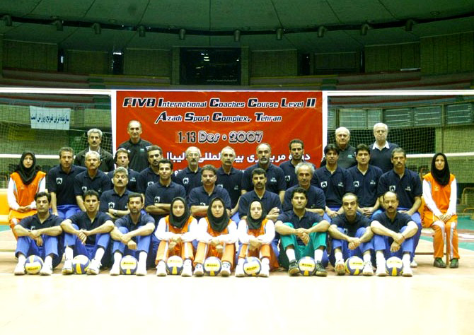 Dnes mohou v Íránu ženy sportovat v přítomnosti mužů pouze v oblečení, jaké vidíme na snímku z roku 2007 a mezinárodního kurzu trenérů FIVB v Teheránu (Míla Ejem druhý napravo stojící).