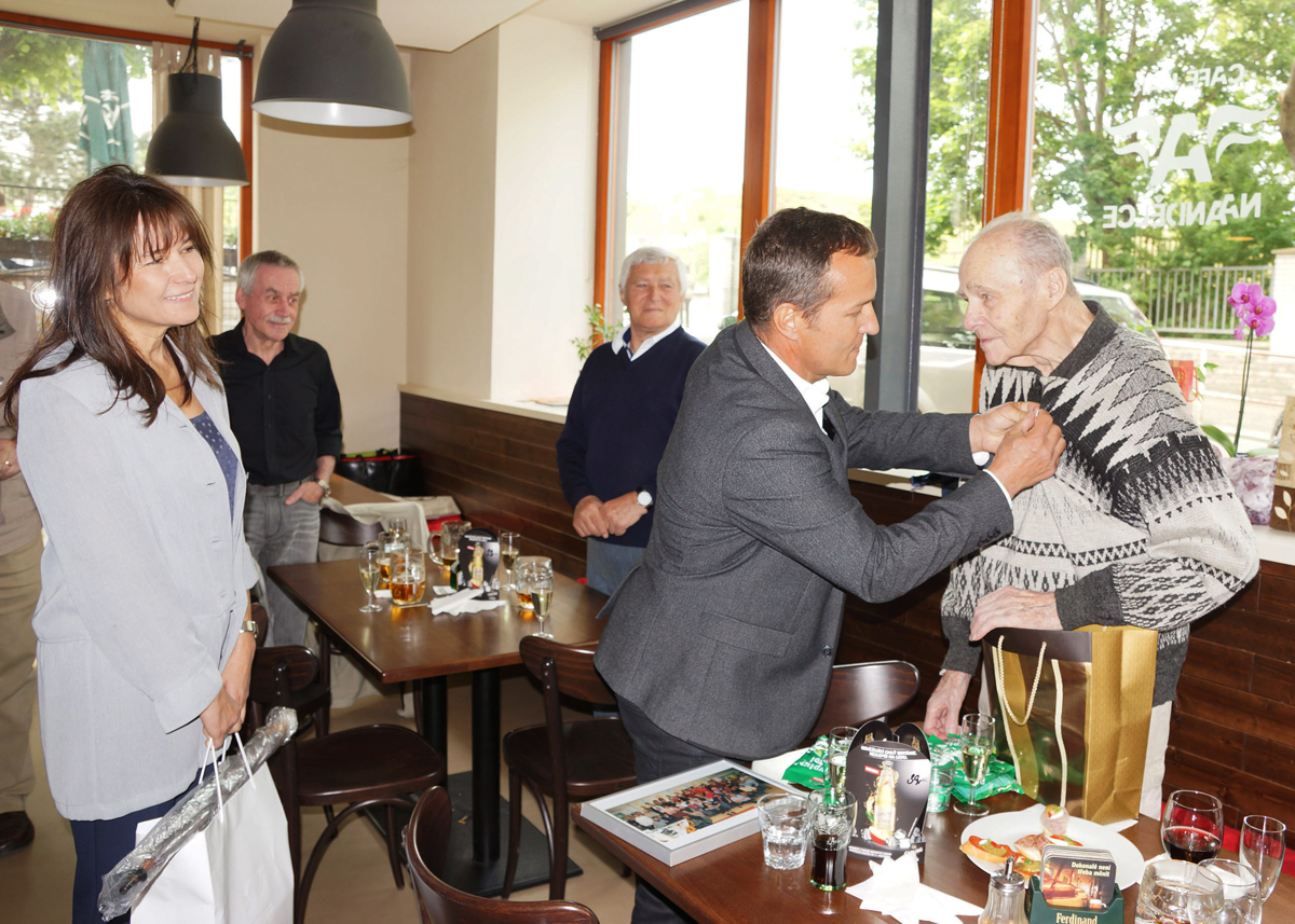 Mezi gratulanty nechyběl předseda Tatranu Střešovice Ing. Martin Vaculík, který jubilanta dekoroval medailí za zásluhy o rozvoj střešovické TJ. Nalevo místostarostka Prahy 6 Ing. arch. Eva Smutná a v pozadí zástupci Komise společenského významu volejbalu ČVS Z. Vrbenský a V. Kobliha.
