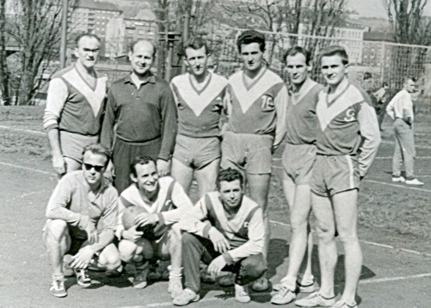 Volejbalisté Slavoje Praha 7 v přeboru Prahy I. třídy, nahoře zleva dvě volejbalové legendy – DĚDEK Jiří Těšitel a internacionál Jiří Jonáš, Milan Plašil, Jirka Pavelka, neznámý hráč a Mirek Šamonil, dole zleva Ríša Klíma, Jirka Demuth a Láďa Vrbenský. Základ tohoto družstva tvořili hráči bývalého Spartaku ČKD Stalingrad, který po likvidaci volejbalového oddílu ve Vysočanech přešel do Holešovic.