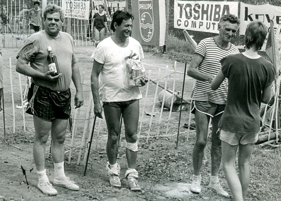 Jubilant při přebíráni jedné z cen deblového turnaje veteránů ve Sklenařicích, první zleva Vojta Věchet senior, významná osobnost nymburských deblů.