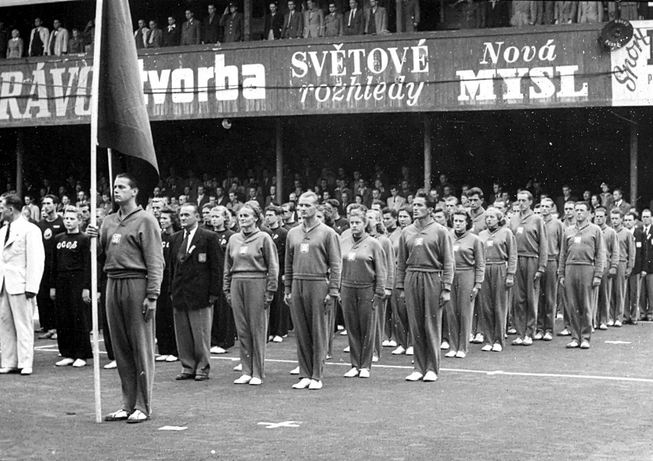 První snímek je ze slavnostního nástupu účastníků I. MS mužů a současně I. ME žen, které v roce 1949 hostila Praha a jehož dějištěm se stal ještě nekrytý Zimní stadion na Štvanici. V čele v roli vlajkonoše Josef Brož a za ním v teplácích Anna Stibitzová, organizační vedoucí závěrečné přípravy našich RD a Jaroslav Vévoda. Za nimi pak družstvo žen s trenérem Miro Rovným z Bratislavy a družstvo mužů s trenérem Janem Fiedlerem. Připomeňme, že oba naše týmy skončily na 2. místě za reprezentanty SSSR.