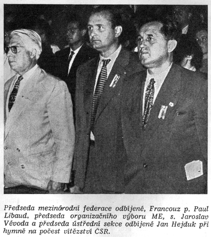 III. ME mužů a žen v roce 1958 svěřila FIVB opět Praze a závěrečné finálové boje se odehrály na již zastřešeném štvanickém „zimáku“. Jaroslav Vévoda (uprostřed na dalším snímku) byl předsedou organizačního výboru šampionátu, jak uvedeno v původním komentáři k fotografii.