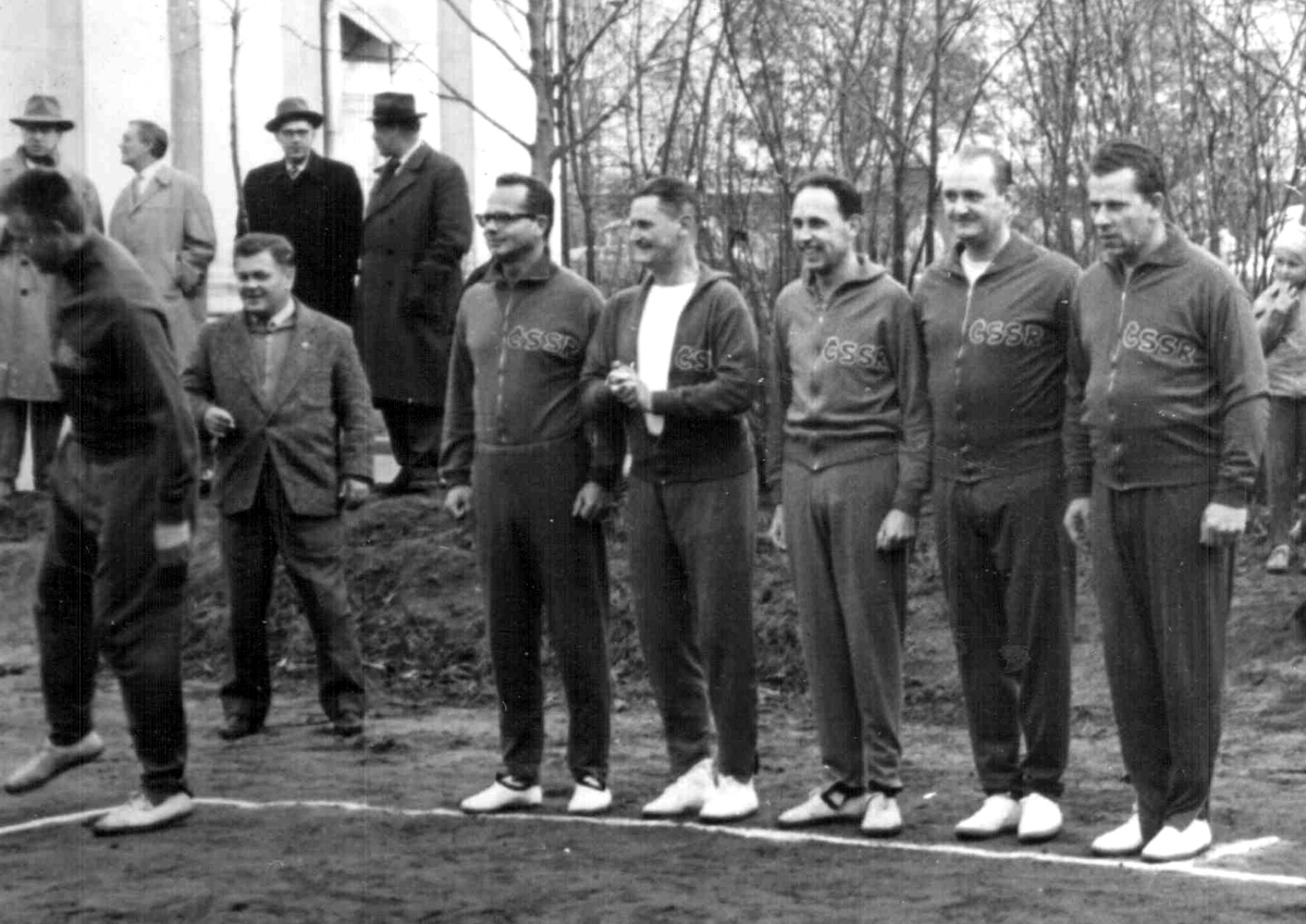 Další snímek pochází z MS 1962 v Moskvě, v jehož rámci došlo k přátelskému utkání funkcionářů čs. výpravy se zaměstnanci naší moskevské ambasády. Vlevo s odstupem trenér družstva mužů ČSSR Josef Brož, lékař výpravy MUDr. Josef Chrástek, rozhodčí Leopold Jebáček, delegáti kongresu FIVB Miroslav Pufler a Jaroslav Vévoda a ústřední svazový trenér Václav Matiášek. Výsledek utkání se nedochoval ...