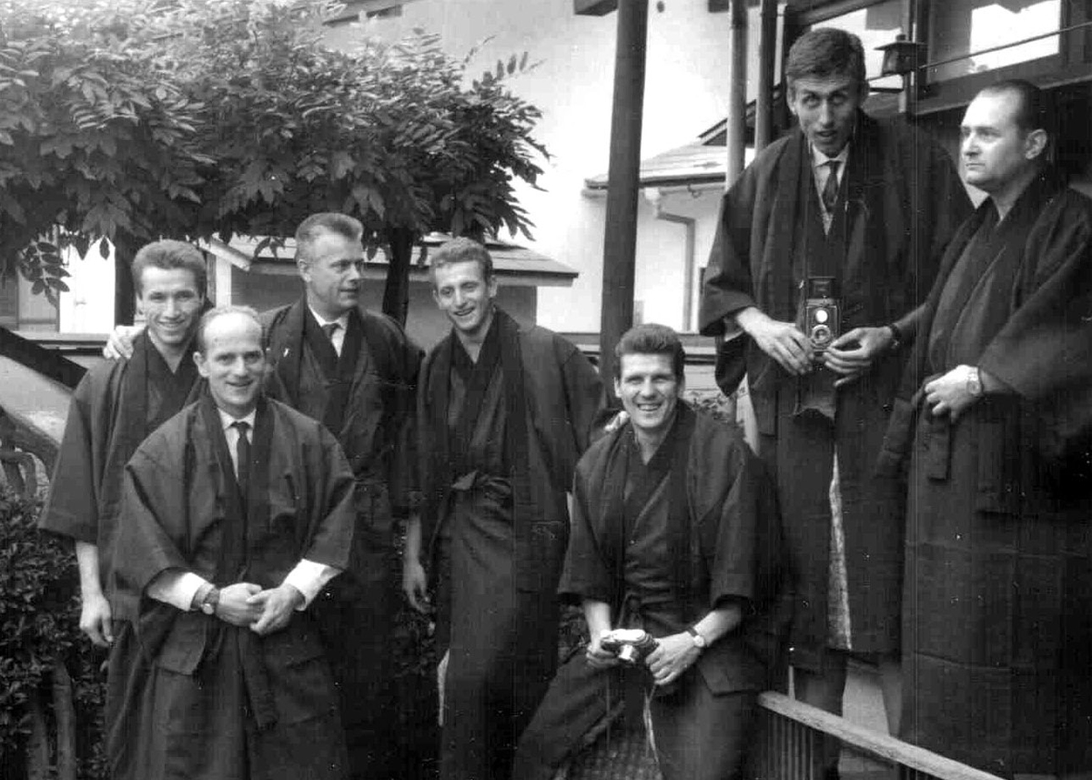 Poslední snímek je z tokijské olympiády 1964, resp. z následného pobytu našeho stříbrného družstva mužů v Japonsku, při kterém sehráli několik exhibičních utkání. V tradičních kimonech zleva Čuda, Paulus, J. Brož, Perušič, Šorm, Schenk a Jaroslav Vévoda – na OH opět jako delegát kongresu a čelný funkcionář FIVB.
