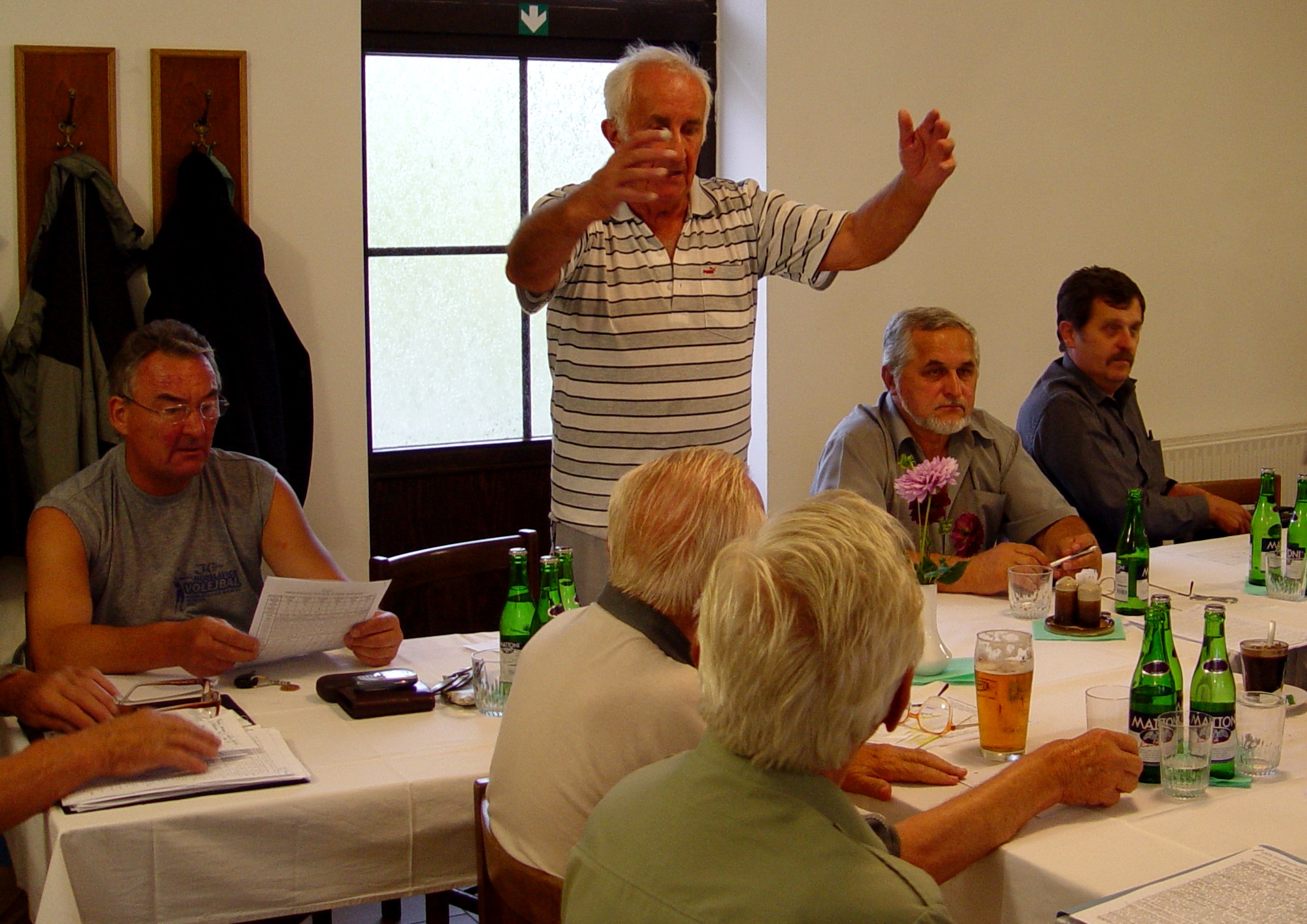 Další snímek je z roku 2004, ve kterém svolal V. V. (coby předseda Komise společenského významu volejbalu ČVS) do východočeských Čestic v rámci Národního finále vesnických družstev své „podřízené“, tj. předsedy krajských KSVV. Nalevo Mirek Vyhlídal (jeho nástupce ve funkci předsedy KSVV ČVS), před rozkládajícím Vladimírem sedí zády Josef Cábal a Jaroslav Kryspín (oba již také „na pravdě Boží“), napravo František Janík a Václav Nidrle.
