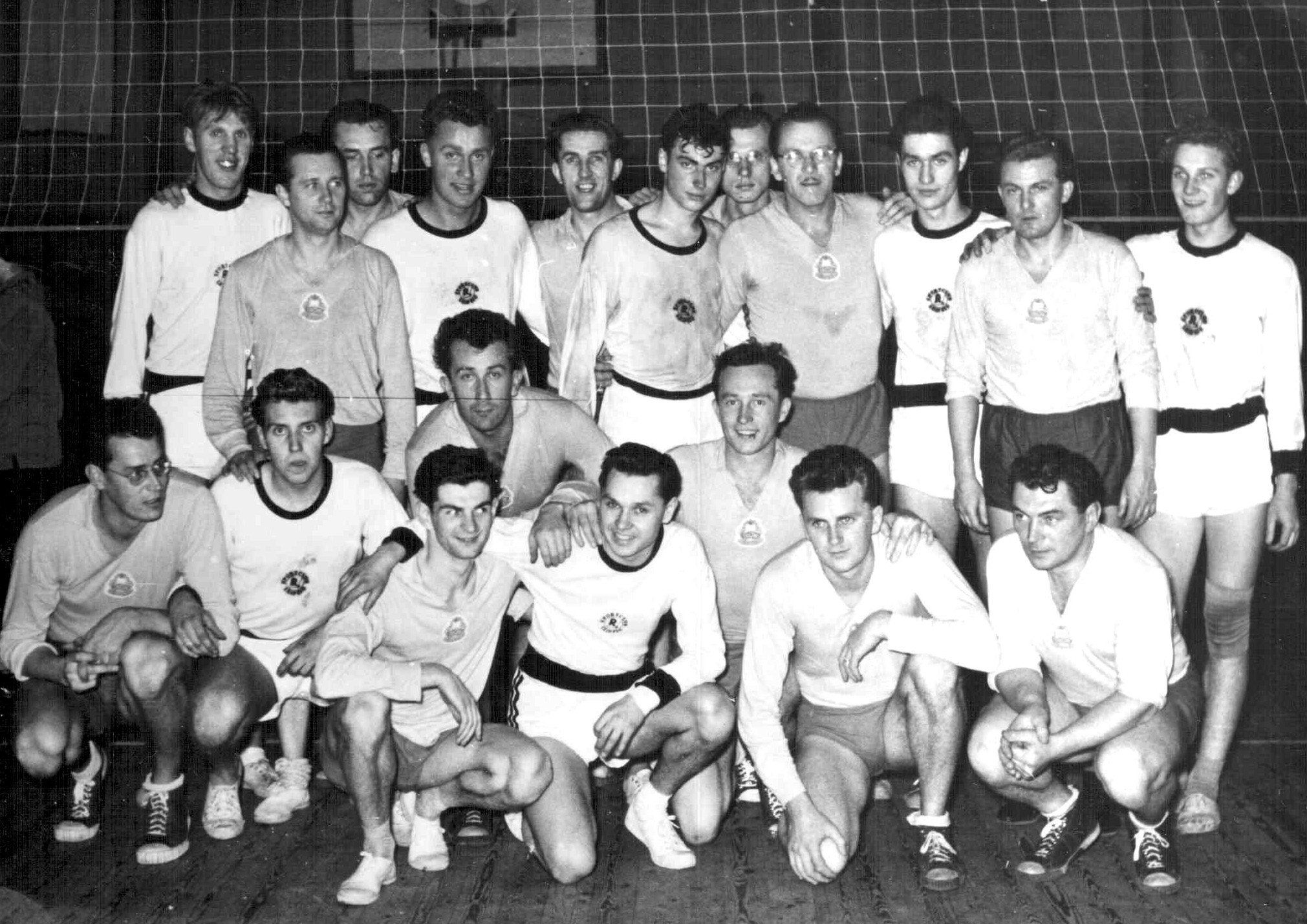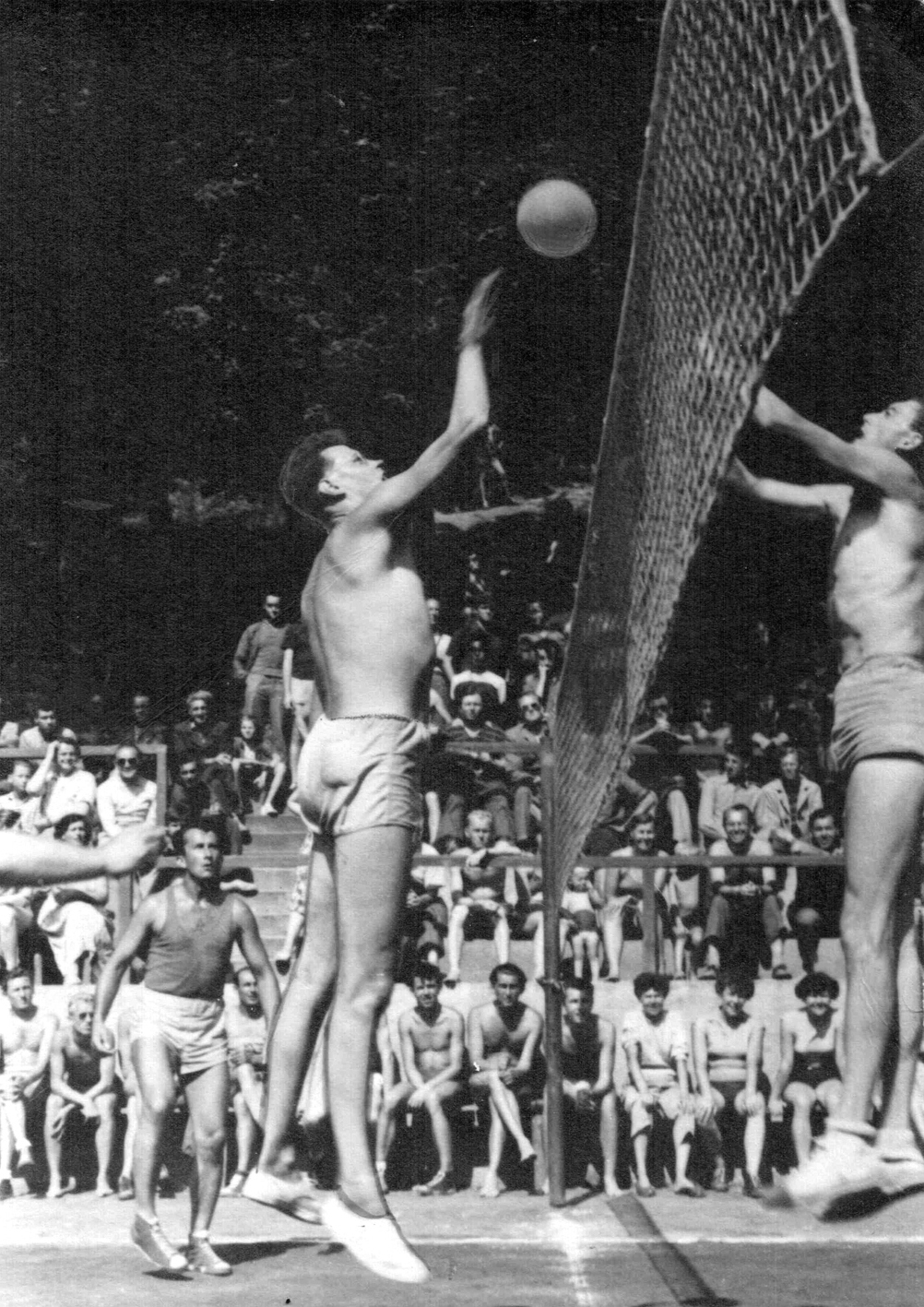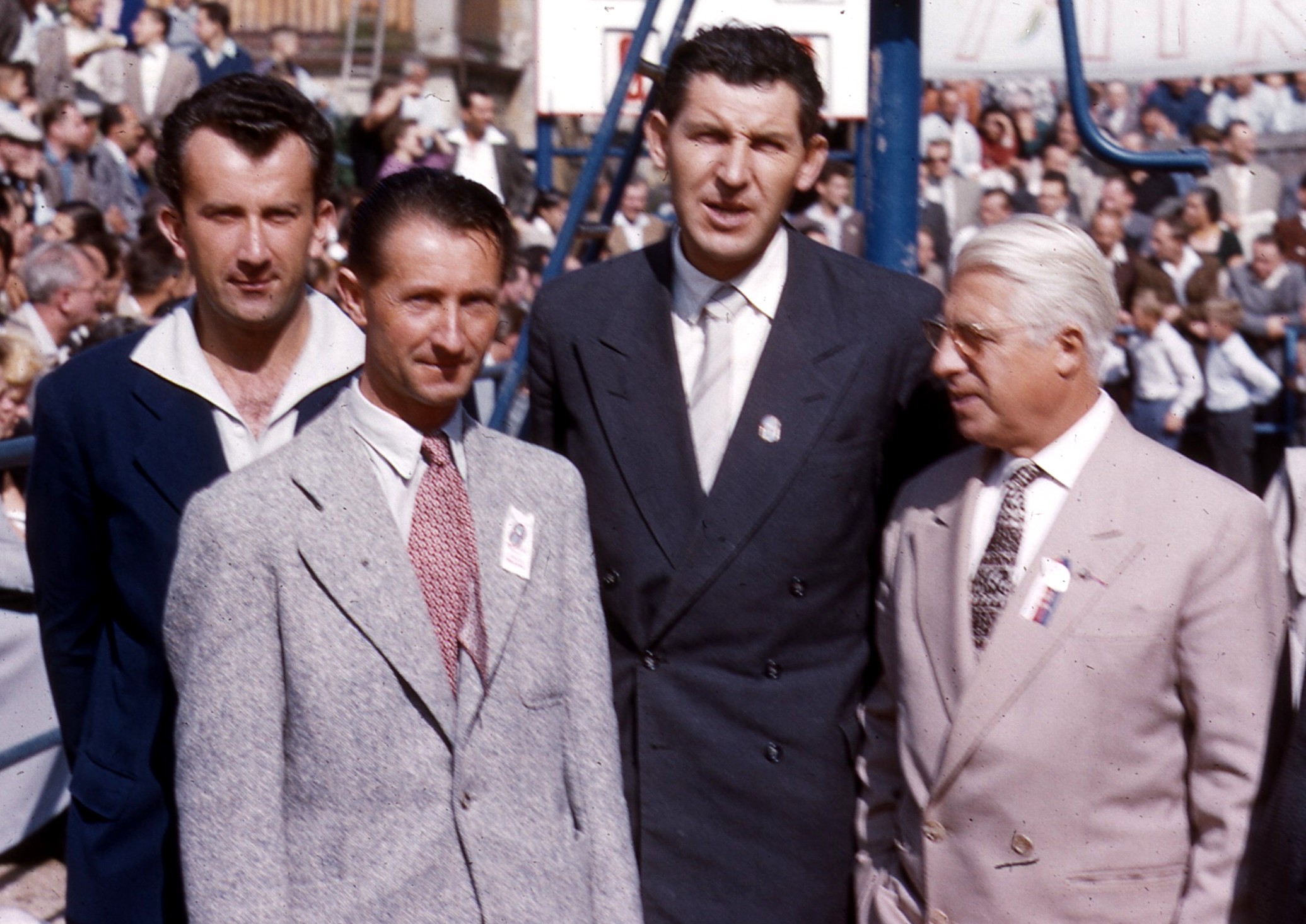 Barevný snímek je z roku 1958, kdy nám bylo svěřeno pořadateství ME mužů a žen. Finále se hrálo v Praze na Štvanici, jedna ze skupin v Liberci, odkud je i snímek. Nalevo V. Vyoral již v pozici sekteráře Ústřední sekce odbíjené ÚV ČSTV (neboli Československého volejbalového svazu), dále vpravo Jaroslav Maděra (předseda Krajského výboru svazu a vedoucí liberecké skupiny), dr. Otakar „Otyla“ Koutský (v té době viceprezident FIVB) a prezident FIVB Paul Libaud z Francie.