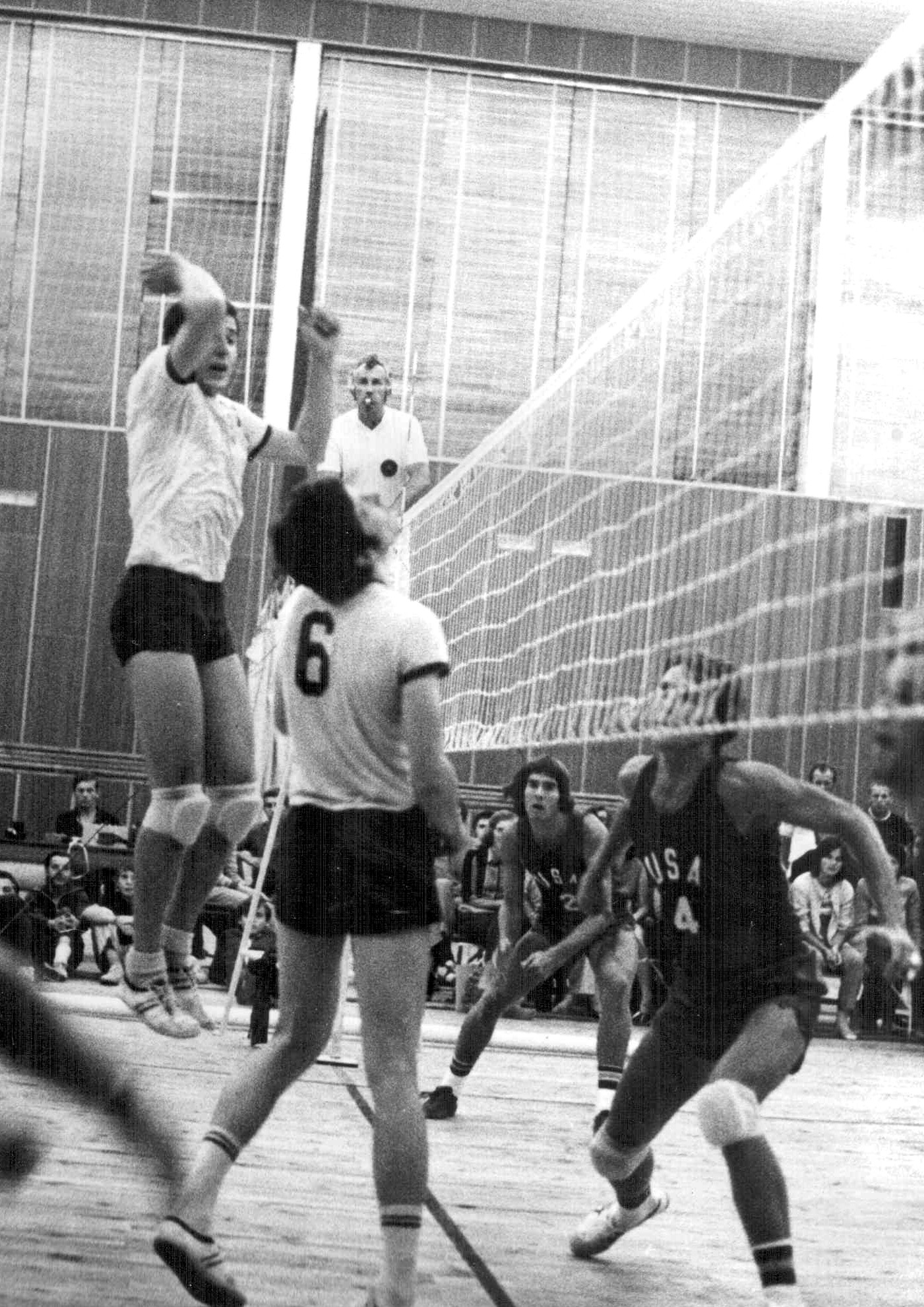 Kromě vrcholových svazových funkcích se V. V. stal i váženým rozhodčím, od roku 1961 řídil utkání mužů a žen v nejvyšších soutěžích (1. a 2. lize) a v roce 1968 získal certifikát mezinárodního rozhodčího FIBV. S píšťalkou se podíval nejdále do Japonska, podle dostupných informací byl delegován a řídil utkání na dvou MS (určitě na MS 1974 v Mexiku) a jednom ME. Na snímku je V. V. na empire při řízení mezistátního utkání mužů ČSSR – USA, které bylo sehráno v roce 1973 v hale TS Nymburk. Na naší straně hřiště s č. 6 nahrávač Jaroslav Stančo a ve výskoku (fintující rychlík) Zdeněk Jindra.