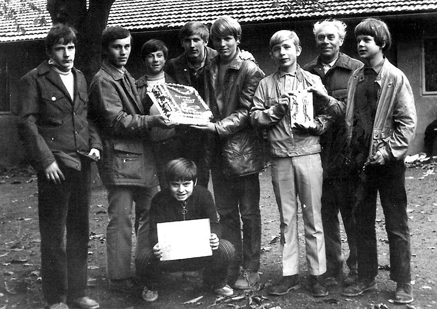 Na druhém snímku trenér Alois Zyka se svými svěřenci, volejbalovými žáky Sokola Slavkov s dortem a diplomem po vítězném turnaji.