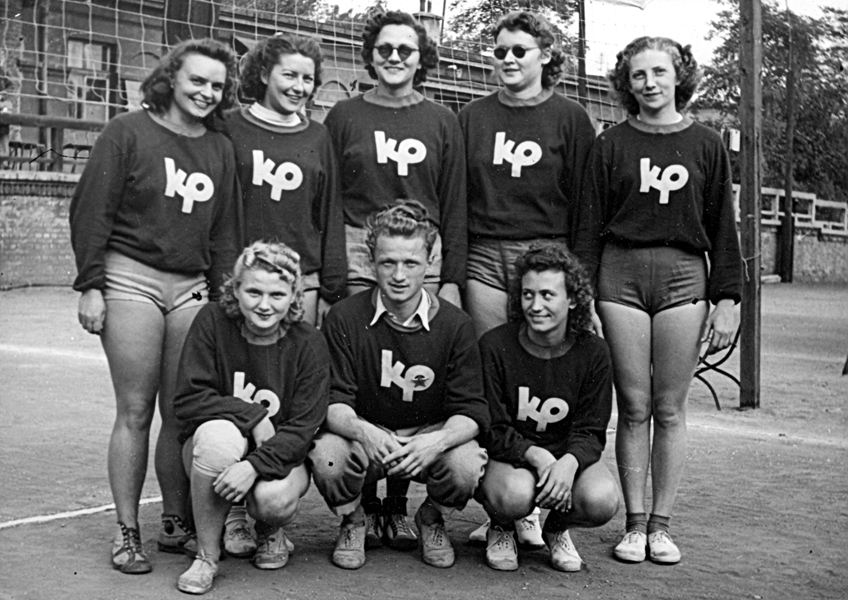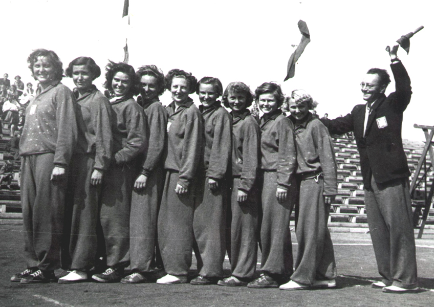 Na Světových akademických letních hrách v Berlíně 1951 obsadily naše vysokoškolačky 2. místo ve složení zleva Čadilová, Kučerová, Lútočková, Svobodová, Cvilinková, Richterová, Černá, Štulcová a Soňa Balunová. S deštníkem trenér ing. Vladimír Míka.