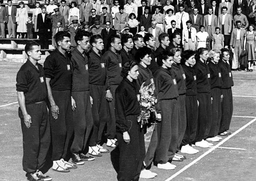 Snímek z nástupu našich reprezentačních výběrů před mezistátním dvojzápasem s Maďarskem v Budapešti roku 1950. Muži zleva: Brož Josef, Tesař, Krob, Brož Karel, Mikota, Schwarzkopf, Fučík, Matiášek, Votava, Paldus. Ženy zleva: Zaplatílková, Šrůtová, Krimlová, Cígrová, Houdková, Batková, Soňa Burianová, Chlupová.