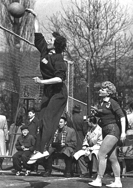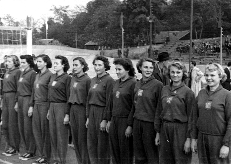 Na Festivalu mládeže a studentstva v Bukurešti 1953 obsadily naše ženy 2. místo za Sovětkami. Na snímku zleva rozhodčí Luboš Kettner, Cígrová, Soňa Balunová, Dostálová, Nečasová, Zaplatílková-Jílková, Valášková a trenér Metoděj Mácha. Dole zleva Krimlová, Svobodová, Štaudová, Štulcová a Matalíková.
