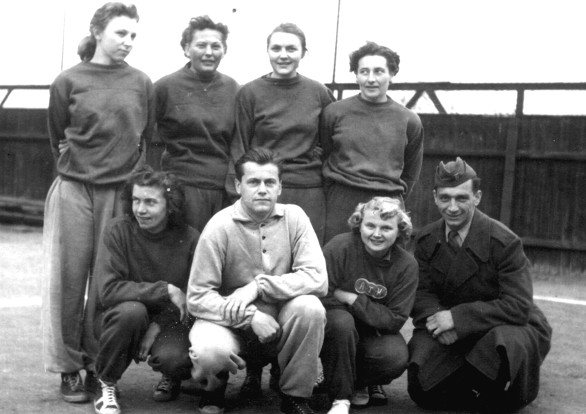 V roce 1953 byl Armádní tělovýchovný klub (ATK) přejmenován na Ústřední dům armády (ÚDA) a vedle mistrovského družstva volejbalistů vzniklo i armádní družstvo žen. Prvními hráčkami byly převážně atletky ÚDA, nahoře zleva Dáša Olešovská, Růžena Jírová (manželka trenéra fotbalistů ÚDA), Táňa Kostrjuková (později manželka Josefa Brože) a Dana Zátopová. Dole zleva Jarka Brožová (manželka Karla Brože), trenér Josef Brož, Soňa Balunová a Jaroslav Doležal (hráč mužů a pomocný trenér žen).