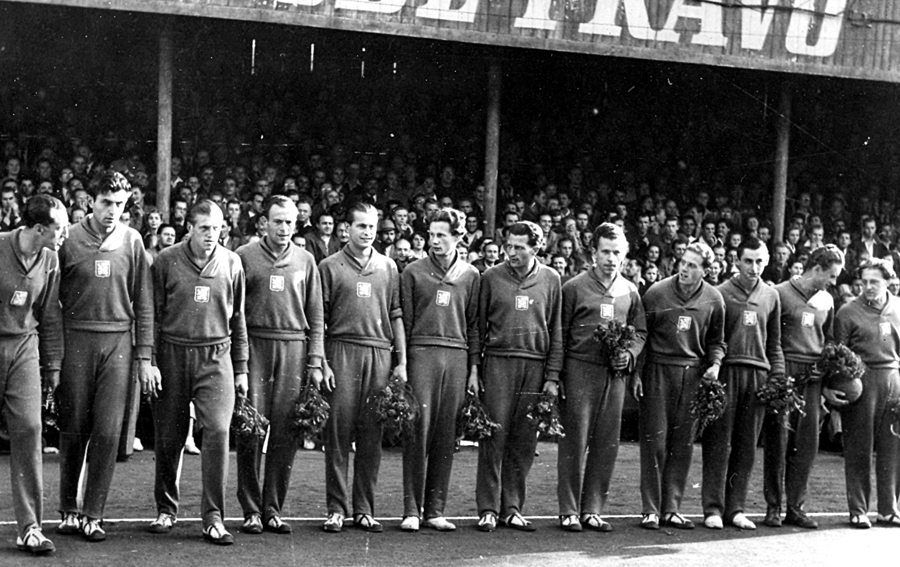 V předzápase prvního poválečného mezistátního utkání mužů ČSR - Francie 27. srpna 1946 v Praze porazili Lvíčata ČSR výběr mužů Prahy (po boji 2:1). V tomto utkání na sebe bratři Brožovi poprvé oblékli reprezentační dres a s nimi další z legend našeho volejbalu. Na snímku zleva Zdeněk Soukup, Josef Brož, neznámý hráč, Jaromír Paldus, František Mikota, Karel Brož, Josef Votava a Rudolf Taubman.
