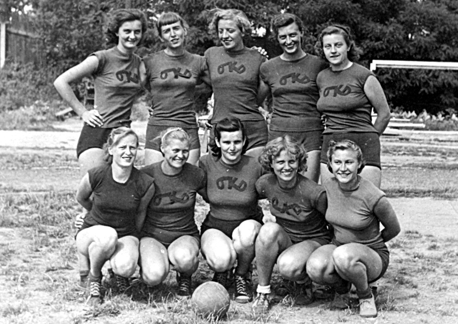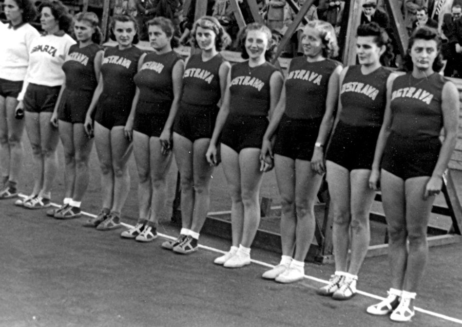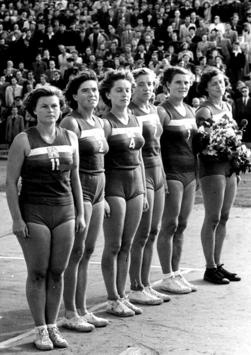 V roce 1949 bylo na pražské Štvanici sehráno první ME žen s účastí výběrů 7 zemí. Naše ženy po jediné prohře se Sovětkami vybojovaly na domácí půdě stříbrné medaile a o tento úspěch se zasloužil kolektiv na dalším snímku. Zleva stojí Batková, Cigrová, Čadilová, trenér Miroslav Rovný z Bratislavy, Hroudová, Valášková a Marynčáková, dole zleva Bernovská (jediná Slovenka), Cvilinková, Mirovická, Zaplatílková a Krimlová. Na snímku chybí vyloučená Dostálová.