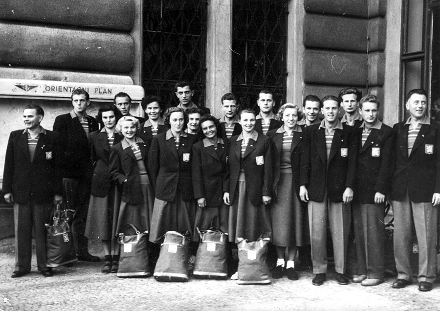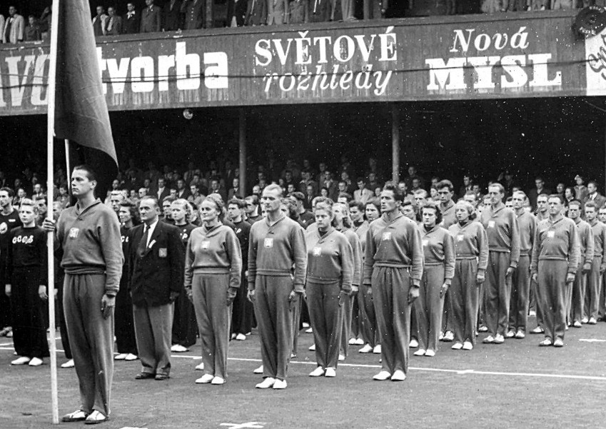 První snímek je ze slavnostního zahájení MS mužů a ME žen v Praze na Štvanici v roce 1949. Trenér našich mužů Jan Fiedler stojí v čele prvního zástupu napravo (za ním Paldus a Votava). Vlajkonošem reprezentace ČSR byl Josef Brož, za ním stojí v teplácích vedoucí přípravy Anna Stibitzová a „politický pracovník“ Jaroslav Vévoda, za nimi Naďa Marynčáková, trenér žen Miro Rovný a zbývající hráčky a hráči.