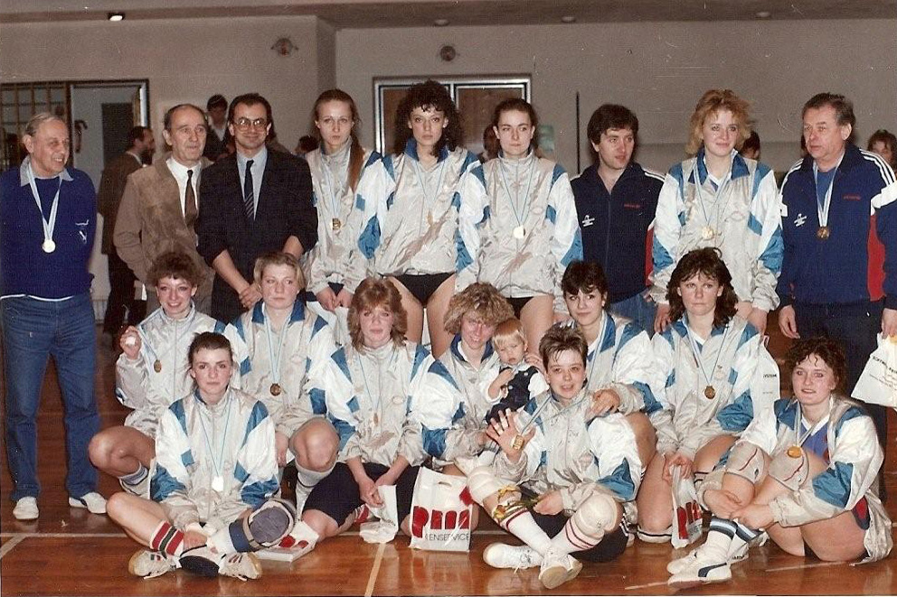 Mistrovský celek KPS Brno po zisku titulu v roce 1990. Zleva stojí druhý trenér Zbyhněv Ondráček, člen výboru Milan Novotný, předseda oddíl Jiří Gottwald, Gottwaldová, Němcová-Jurášová, Prokešová, lékař Pavel Homolka, Veselá a první trenér Milan Kafka, klečící zleva (2. řada) Černá, Vostřejšová, Laoubalová, Cvrkalová (s dítětem), Bardiovská, Provazníková a sedící zleva Leona Goldemundová, Kumpochová-Jedličková a Přibylová.