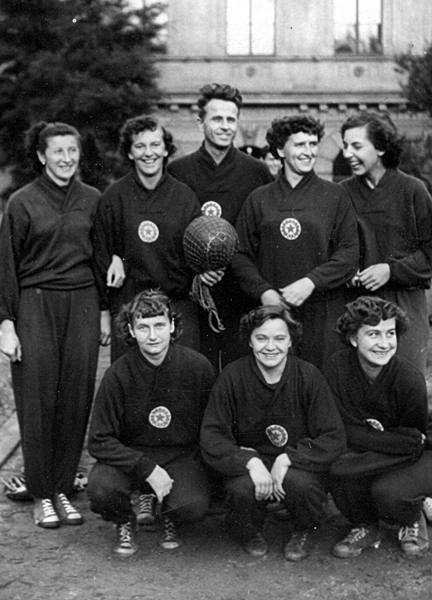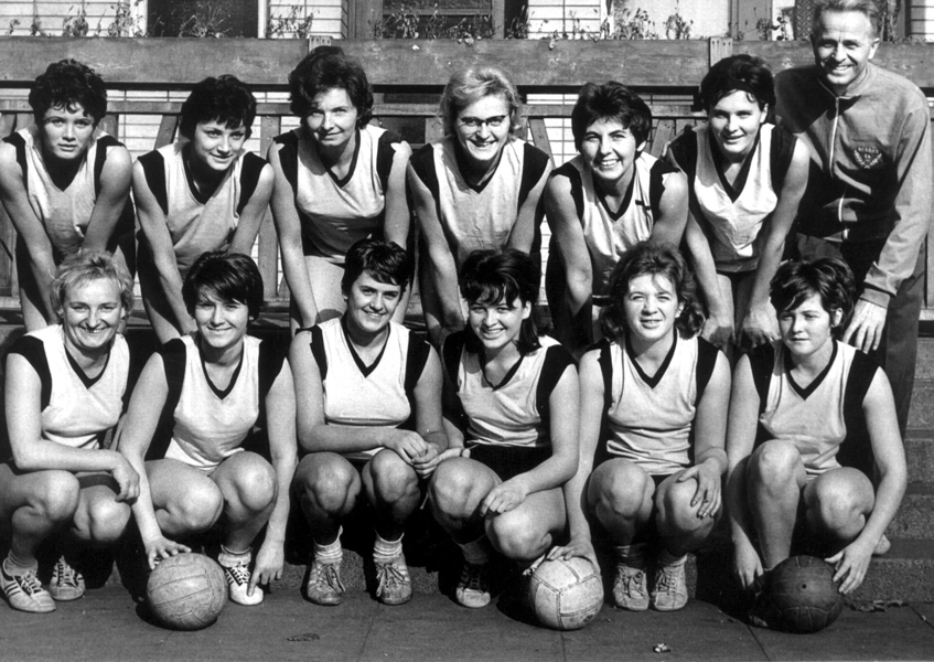 Na ME 1958 v Praze vybojovaly naše ženy stříbrné medaile ve složení (zleva) kapitánka Vráželová, Špelinová, Holubová, Svozilová, Šteflová Božena, Drahoslava Křížová, Uhrinová, Ulmonová, Matalíková, Kyselková, Moravcová a Paclíková, trenérem družstva byl dr. Josef Češpiva.