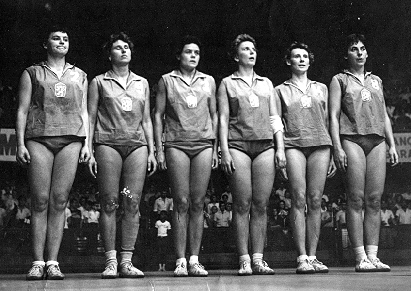 Z brazilského Rio de Janeiro přivezly naše ženy z MS 1960 bronzové medaile (1. SSSR, 2. Japonsko). Na snímku je naše šestka po utkání s Brazilkami (3:0), zleva Obadálková, Moravcová, Kyselková, Šormová, Vráželová a Holubová. Na MS dále startovaly Drahoslava Křížová, Svozilová, Špelinová, Štefflová Hedvika, Ulmonová a Žižkovská, trenérem byl dr. Josef Češpiva.