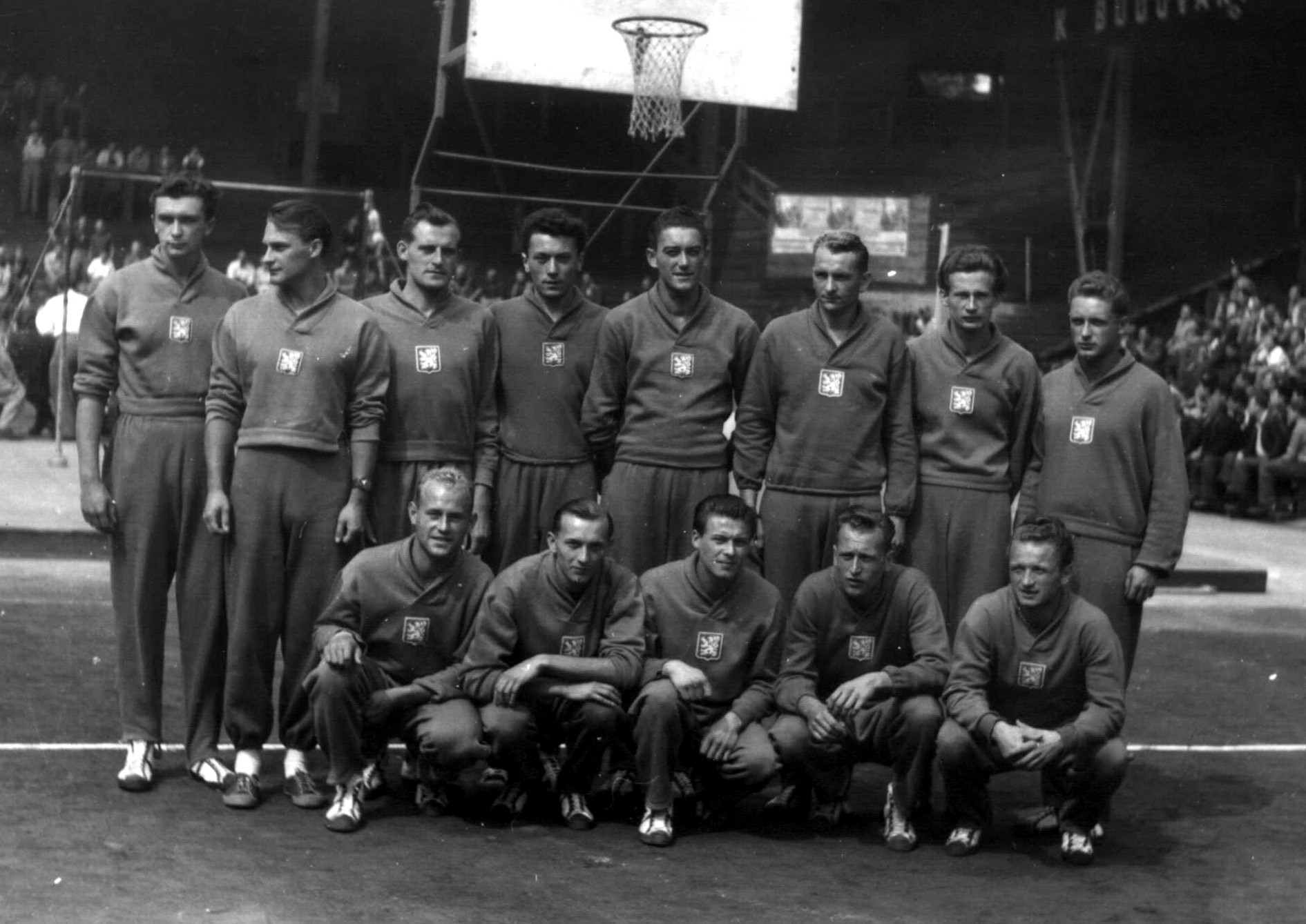 Po dvou stříbrných medailích z MS 1950 v Sofii a MS 1952 v Moskvě získal J. J. svou nejcennější trofej na ME 1955 v Bukurešti. Měla cenu zlata a patřil k ní titul Mistra Evropy. Na snímku po vítězném utkání s Polskem (3:0) a vztyčování naší vlajky stojí zleva smečaři Tesař a Karel Brož, smečující nahrávači (tzv. dvojky) Jonáš a Paldus a nahrávači Musil a Paulus.