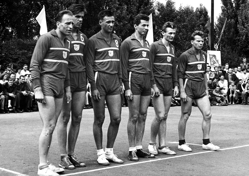 Na Festivalu mládeže a studentstva 1955 ve Varšavě naši muži zvítězili a ženy skončily na 2. místě za domácími Polkami (týmy SSSR nestartovaly). Na snímku z cestování během akce jsou zleva Toman, Kemel, Špelinová, Nečasová, Golian, Dostálová, a Purnoch, nad nimi v autobusu zleva Moravcová, Petr, Mičánková a Malý.