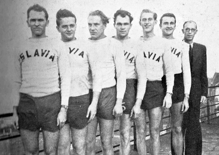V roce 1946 skončili muži SK Slavia Praha v české zemské lize na 2. místě a ve finále mistrovství republiky v Židenicích na 3. místě za SK Židenice Brno a Sokolem Pardubice. Na snímku zleva Kozák, Bauer, „Pipek“ Malý, Doležal, Kraus, Škop a trenér Zdeněk Liška (na snímku chybí hráči Šíbl a Vondřich).