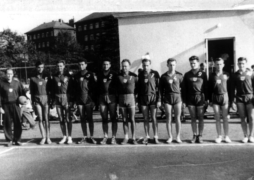 V roce 1954 se družstvo mužů Slavie VŠ Praha poprvé probojovalo mezi elitu. V oblastním přeboru skončilo na 2. místě za ÚDA Praha, ve finále MR v Sokolově kleslo sice na 5. místo, ale tímto úspěchem si vybojovalo účast v celostátní I. lize, ustavené natrvalo od roku 1955. Družstvo získalo příchodem reprezentanta Zdeňka Malého z ÚDA Praha a kvalitní přípravou za pomoci externího trenéra Josefa Kozáka. Na snímku zleva: trenér doc. Kozák, Purnoch, Zdeněk Humhal, Petr, Chvála, Miloslav Humhal, Malý, Barchánek, Řeháček, Ladislav Musil (starší bratr Josefa) a Hartman.