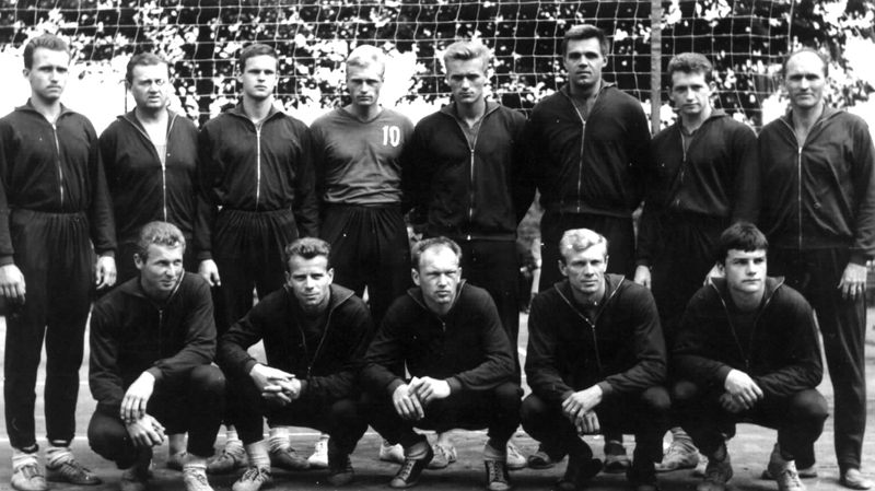 V roce 1964 se muži Slavie VŠ Praha stali v Jihlavě naposledy mistry republiky již s omlazenou sestavou. Nahoře zleva Pitter, vedoucí družstva František Dolák, Barda, Šopa, Viche, Purnoch, Zenker a trenér doc. Josef Kozák, dole zleva Pospíšil, Musil, Chour, Stolařík a Straka. Na snímku chybí Humhal, který v době jihlavského finále rehabilitoval po zlomenině nohy, aby se (na poslední chvíli) stihnul připravit na olympijský turnaj v Tokiu.