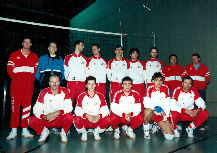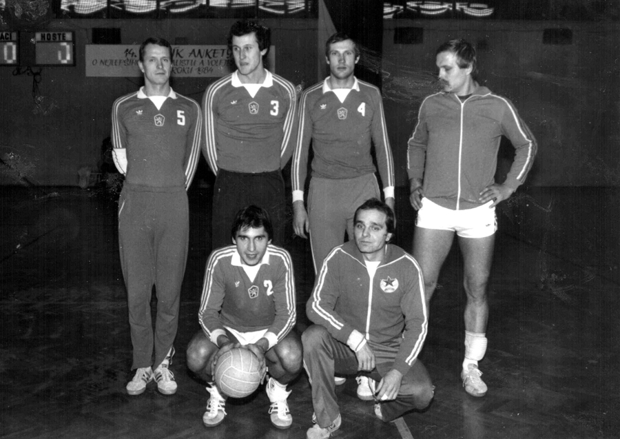 Poslední medaili přivezli naši volejbalisté naposledy v roce 1985 z ME v Nizozemsku a měla cenu stříbra. Snímek dokumentuje radostný návrat naší výpravy, zleva stojí lékař MUDr. Pávek, trenér Karel Láznička, jeho asistent Miroslav Nekola, Milan Černoušek, Jamka, Kaláb, Šmíd a Strumiensky, dole zleva Josef Novotný, kapitán Cyril Krejčí (vyhlášený nejlepším hráčem šampionátu), Bláha, Barborka, Chrtianský, Prieložný a Mikyska.