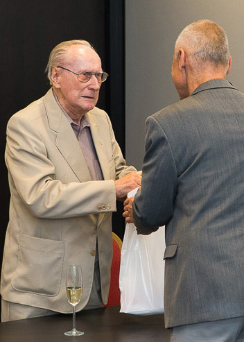 Poslední dva snímky jsou ze setkání jubilantů ČVS v Praze 23. 5. 2015. Na prvním při neformální debatě s dalším z jubilantů Mílou Ejemem (80 let), na druhém přijímá gratulaci a upomínkové předměty z rukou předsedy ČVS dr. Zdeňka Haníka.