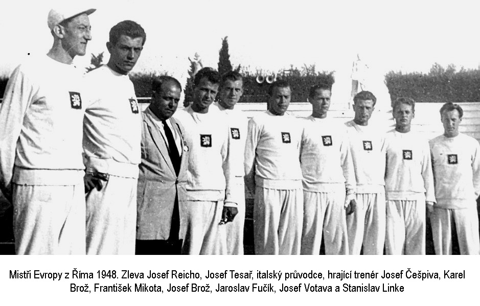 Mistři Evropy z Říma v roce 1948, zleva: Reicho, Tesař, italský průvodce, hrající kouč Češpiva, K. Brož, Mikota, J. Brož, Fučík, Votava a Linke. Vedoucím výpravy byl předseda svazu Jaroslav Kozel, namísto trenéra Zdeňka Lišky (který družstvo na turnaj v Třeboni připravoval) odjel do Říma svazový náčelník Jan Buddy Štolc a namísto desátého hráče Palduse historicky první „očko“ (neboli tajuplný pan Svoboda z Bratislavy – tajný agent STB).