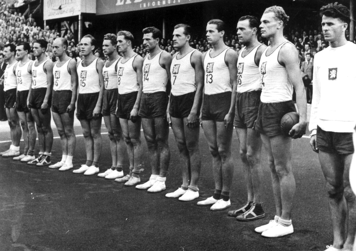 Výběr volejbalistů ČSR pro mezistátní utkání s USA v červnu 1948 v Praze na Štvanici, které skončilo našim vítězstvím 3:1. Zleva Linke, Zeman, Paldus, Taubman, Vondřich, Votava, Kramář, Fučík, Horáček, J. Brož, Mikota, Bernard a kouč dr. Josef Češpiva.
