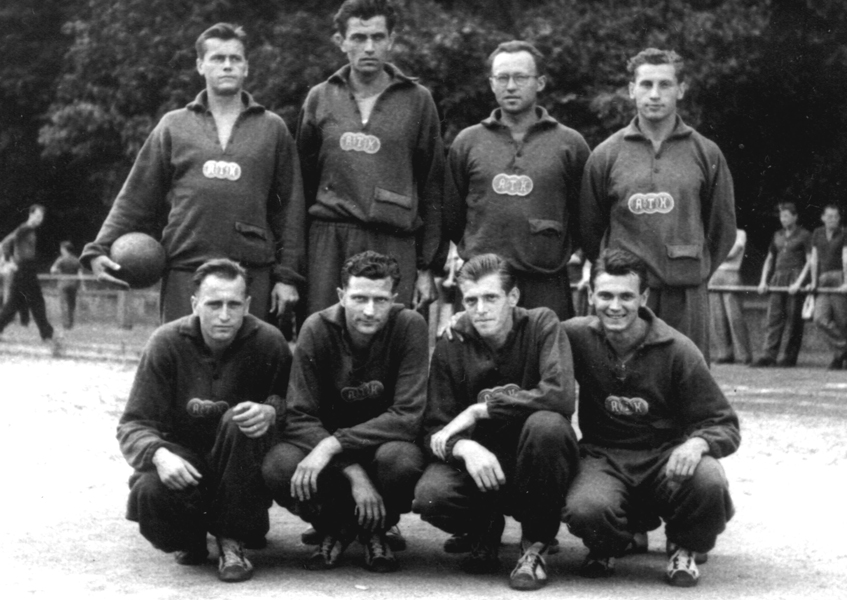 Titulem Mistrů Evropy v roce 1958 na pražském šampionátu naši reprezentanti znovu potvrdili, že jsou momentálně nejlepšími volejbalisty na světě. Jedna ze skupin se hrála na novém stadionu Karla Aksamita v Holešovicích a stojí na něm před utkáním s Francii zleva Paulus, Musil, Paldus, Synovec, Malý, Golian, Kemel, Toman, Humhal, Purnoch, Tesař a kapitán Láznička. Trenérem byl doc. Josef Kozák.