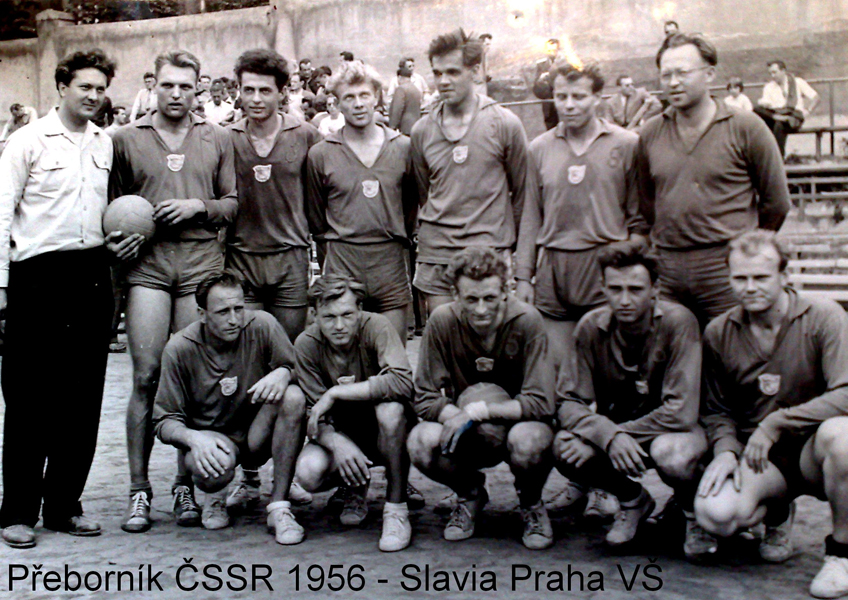 V roce 1956 sesadili volejbalisté Slavie VŠ Praha z mistrovského „trůnu“ armádní celek ÚDA resp. již Dukly Praha, získali svůj první titul a udrželi jej až do roku 1959, tj. čtyři roky po sobě. Nahoře zleva trenér Ing. Břetislav Chvála, Špelina, Petr, Stolařík, Purnoch, Musil a Humhal Miloslav, dole zleva Malý, Chour, Kemel, Humhal Zdeněk a Vůjtěch.