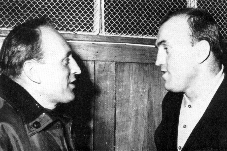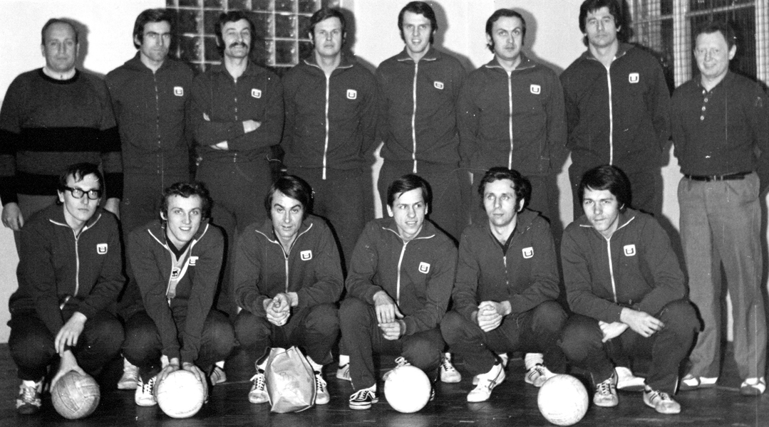 Poslední snímek je z roku 1975 ze setkání našich volejbalových „legend“ v Plzni. Tradici těchto srazů založily ženy již v roce 1968 a po dvou letech „půstu“, vynuceného politickou situací, byla setkání obnovena a trvají dodnes – již přes 40 let! V roce 1975 se ještě hrála „bratrovražedná“ utkání dvou šestek mezi sebou, na snímku stojí zleva čestný host, bývalý předseda svazu Jan Hejduk a hráči Purnoch, Humhal, pod ním v předklonu Karel Brož, Tesař, Josef Brož, Češpiva a Kříž, dole zleva Šorm, Paldus, Fučík (v pozadí), Toman, Malý a Synovec.
