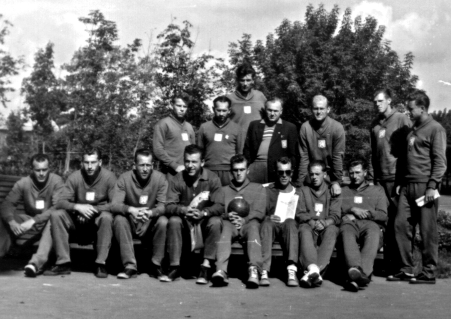 Na veleúspěšném ME 1955 v Bukurešti (muži i ženy mistry Evropy) byl Václav Matiášek v roli ústředního trenéra. Na snímku z Bukurešti se sešla elita naší výpravy, zleva předseda svazu dr. Otakar Koutský, trenér žen Metoděj Mácha, hráčské opory Karel Láznička a Bohumila Valášková, trenér mužů Josef Kozák, techn. vedoucí Jaroslav Maděra a ústřední trenér Matiášek.