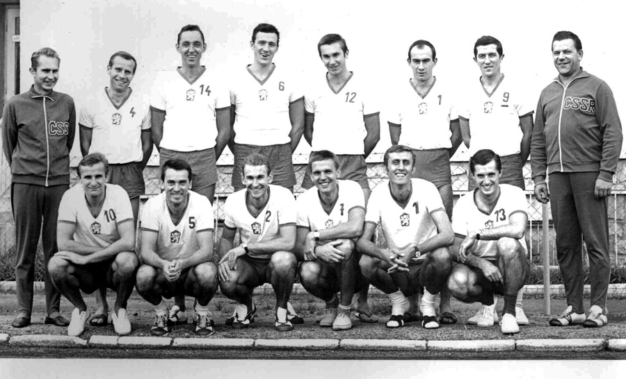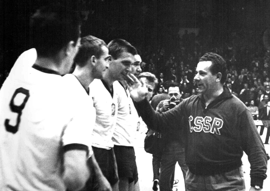 K mužské reprezentaci se V. M. vrátil po OH 1964 v Tokiu (stříbro, trenér Josef Brož) a v roce 1966 s ní vybojoval v Praze druhý titul mistrů světa. Na snímku blahopřeje šťastný trenér Matiášek po závěrečném utkání svým svěřencům k titulu (zleva Golian, Groessl, Kop, Koudelka a Musil). Připomeňme, že o zlato se dále zasloužili hráči Labuda, Mozr, Perušič, Petlák, Schenk, Smolka, Šmídl a asistent trenéra Oldřich Kaplan. Mimořádně šťastným tahem trenéra Matiáška bylo znovuzařazení resp. přemluvení ke startu Goliana a Musila, kteří se po OH 1964 s reprezentací již rozloučili.