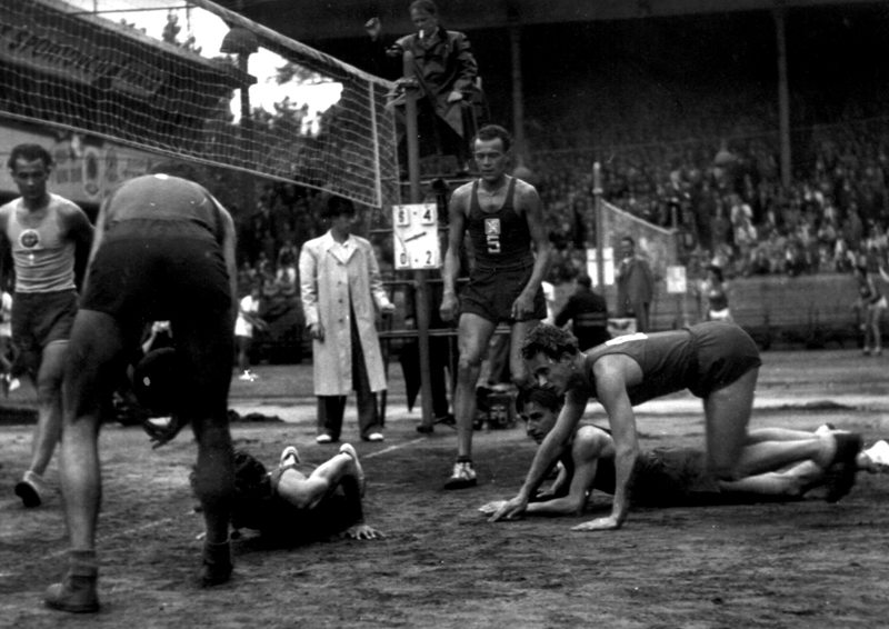 Z MS 1949 na Štvanici je ještě momentka z utkání našich reprezentantů s bronzovými Bulhary (3:0, míče: 8, 1, 8). Pod skloněným Tesařem leží pravděpodobně Fučík, dalším ležícím je Soukup, nad ním v pokleku Schwarzkopf a s č. 5 přihlíží Mikota. Jak je ze snímku patrné, turnaj se hrál systémem dvojutkání - na jednom kurtu muži a na druhém současně ženy.