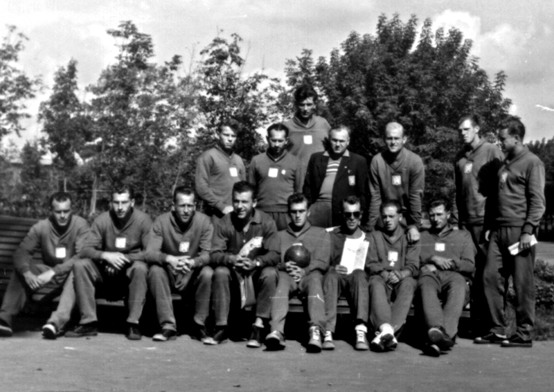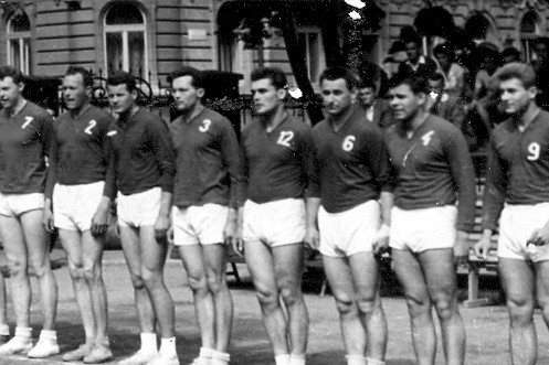 V roce 1954 se uskutečnil zájezd mužů ČSR do Francie a Alžíru. Na snímku je po utkání v Montpelliere společně se soupeři naše šestka (nahoře zleva): Brož Josef, Láznička, Mikota, Paldus, Musil a dole (třetí zprava) Soukup.