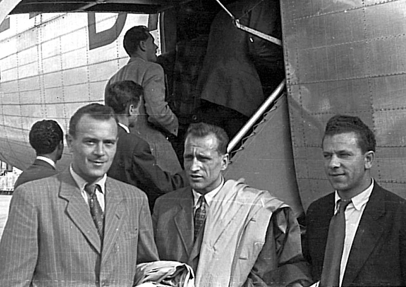 Ze stejného zájezdu je i snímek z leteckého přesunu naší výpravy z Francie do Alžíru, zleva František Mikota a Zdeněk Malý s trenérem Václavem Matiáškem.