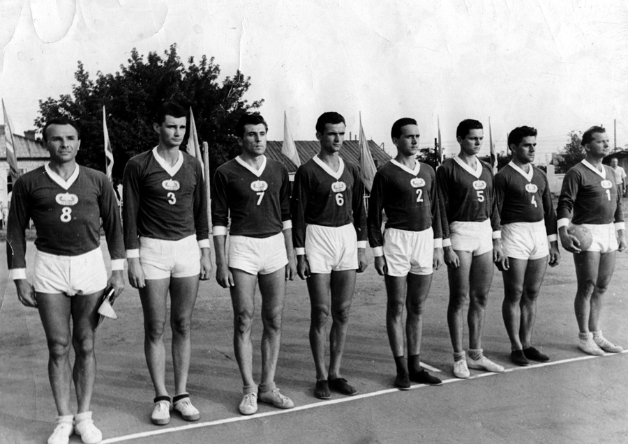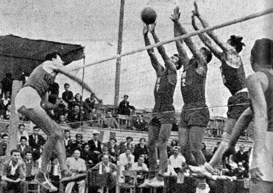 V roce 1948 zvítězili naši reprezentanti na Balkánsko-středoevropských hrách v Sofii, když se svými soupeři z Bulharska, Jugoslávie, Maďarska, Polska, Rumunska a italského Terstu neztratili ani set. Na snímku náš vzorný trojblok (zleva Nogol - Valenta - Bouchal) likviduje jeden z rumunských útoků.