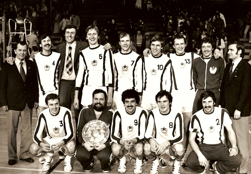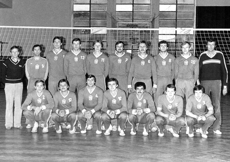 V roce 1982 se naši volejbalisté kvalifikovali na MS v Argentině již pod novým trenérským vedením. Na snímku z přípravy před odletem stojí zleva trenér Dušan Melíšek, Černoušek, Sýkora, Kopecký, Novotný, Pitner a asistent Václav Šmídl, zleva sedí Prieložný, Kaláb, Krejčí, Řeřábek, Pavlík, Hampacher a Repák. Konečné 9. místo by naše současná reprezentace asi brala, v té době se za úspěch ještě nepovažovalo …