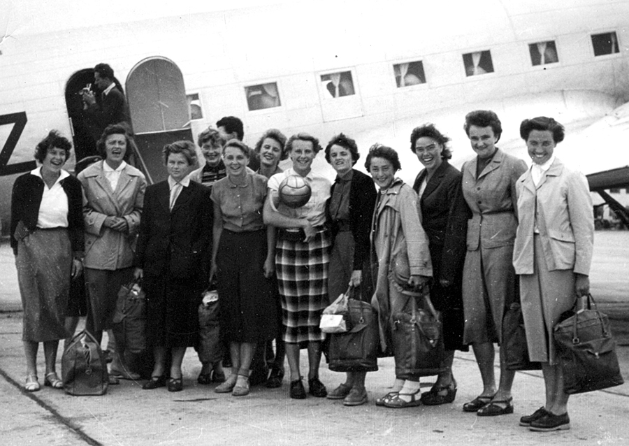 Další snímek našich reprezentantek je ze zájezdu do Polska v roce 1956 (Gdaňsk, Gdyně, Sopoty), který byl jednou z přípravných akcí před MS v Paříži. Zleva stojí vedoucí zájezdu (?), Šindelářová, Valášková, Drahoslava Křížová, Kučerová, Lútočková, Uhrinová, Štaudová a trenér Metoděj Mácha, dole zleva Holá, Ligová, Nečasová, Moravcová a Matalíková.