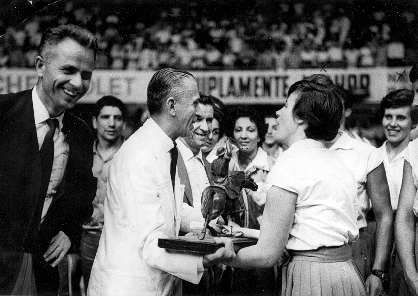 V rámci slavnostního zakončení MS 1960 byly naše ženy vyhlášeny nejsympatičtějším týmem šampionátu. Cenu v podobě bronzové sošky brazilského honáka krav (gauča) z rukou pořadatelů převzala za náš tým kapitánka Regina Obadálková (na snímku). Vlevo se usmívá trenér dr.Josef Češpiva, napravo od Iny Bobina Žižkovská.