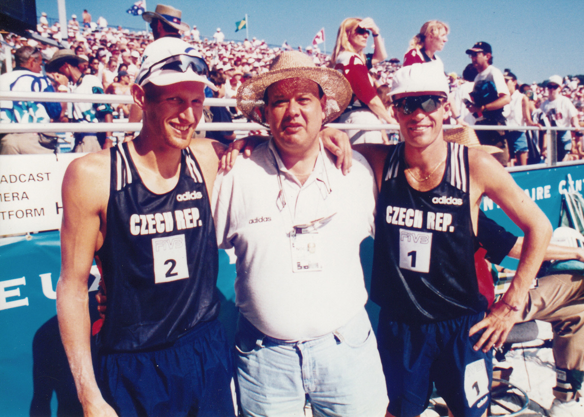 Úspěch BV-páru Marek Pakosta (vlevo) a Michal Palinek v podobě účasti a 13. místa na OH 1996 připomíná snímek z Atlanty, na kterém je spolu s nimi dr. Jan Hronek, v té době místopředseda ČOV a člen správní rady CEV.