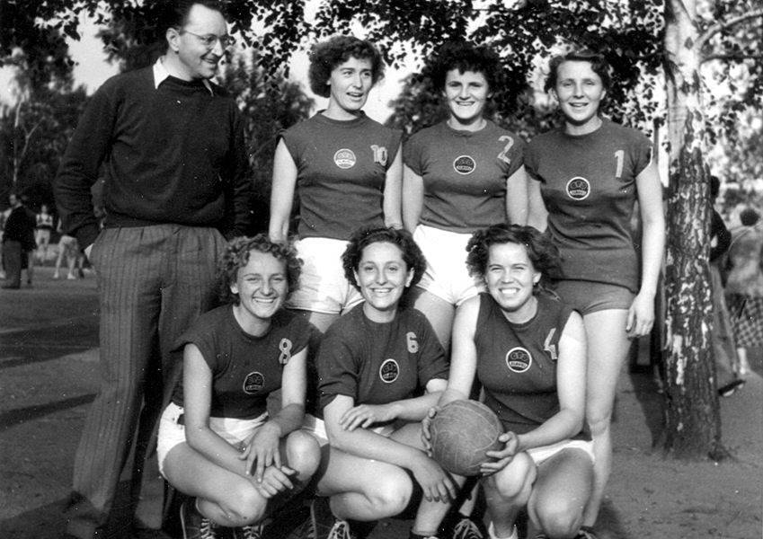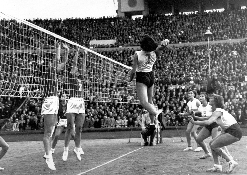 Z moskevského šampionátu 1952 přivezly naše ženy bronzové medaile (1. SSSR, 2. Polsko), na snímku z utkání našich se Sovětkami (0:3) smečuje Božena Cígrová, zleva přihlížejí a vykrývají Svobodová, Štulcová a Černá.